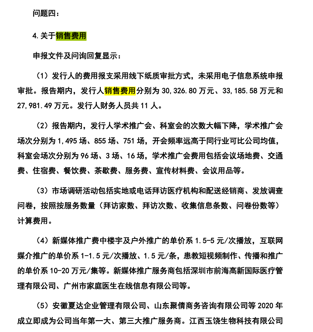 在首轮问询中交易所高度关注了百神药业的销售费用,交易所曾指出“报告期内,发行人学术推广会、科室会的次数大幅下降,学术推广会 场次分别为1,495场、855场、751场,开会频率远高于同行业可比公司均值,科室会场次分别为96场、3场、16场,学术推广会费用包括会议场地费、交通费、住宿费、餐饮费、茶歇费、服务费、宣传材料费、会议用品等。”