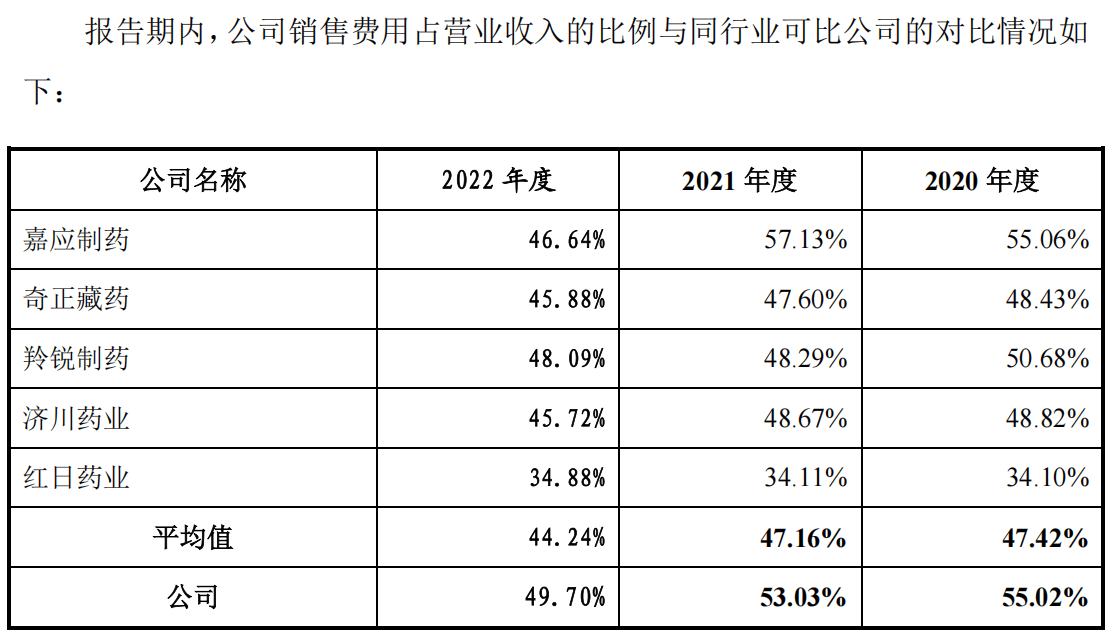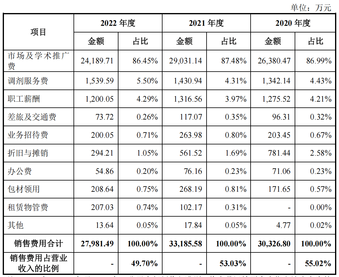 招股书显示,从2020年至2022年,百神药业的销售费用率分别为55.02%、53.03%和49.7%,其销售费用占营收比例长期维持在50%左右。