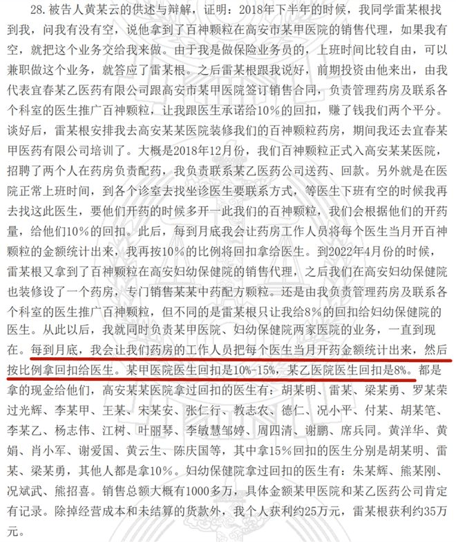根据判决书内容,该案主要被告人黄某云自2018年底起,负责百神药业旗下产品“百神颗粒”在高安市某甲医院的销售。为提升销量,其按照上线雷某根的指示,向医生承诺以开药金额10%–15%的比例支付回扣。所有回扣均以现金形式支付,装在信封中交付医生,涉及医生超过30人。截至案发,黄某云向医生支付回扣总额达192万余元,其个人获利约25万元。