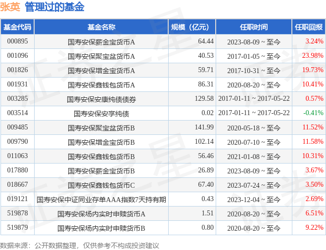 张英女士:中国国籍,硕士,CFA,曾任中国人寿资产管理有限公司国际部研究员。2013年加入国寿安保基金管理有限公司,历任研究员、基金经理助理,现任国寿安保基金管理有限公司基金经理。2017年1月起任国寿安保聚宝盆货币市场基金基金经理,2017年10月起任国寿安保增金宝货币市场基金基金经理。2020年8月20日起任国寿安保场内实时申赎货币市场基金基金经理。2023年8月9日起担任国寿安保薪金宝货币市场基金基金经理。