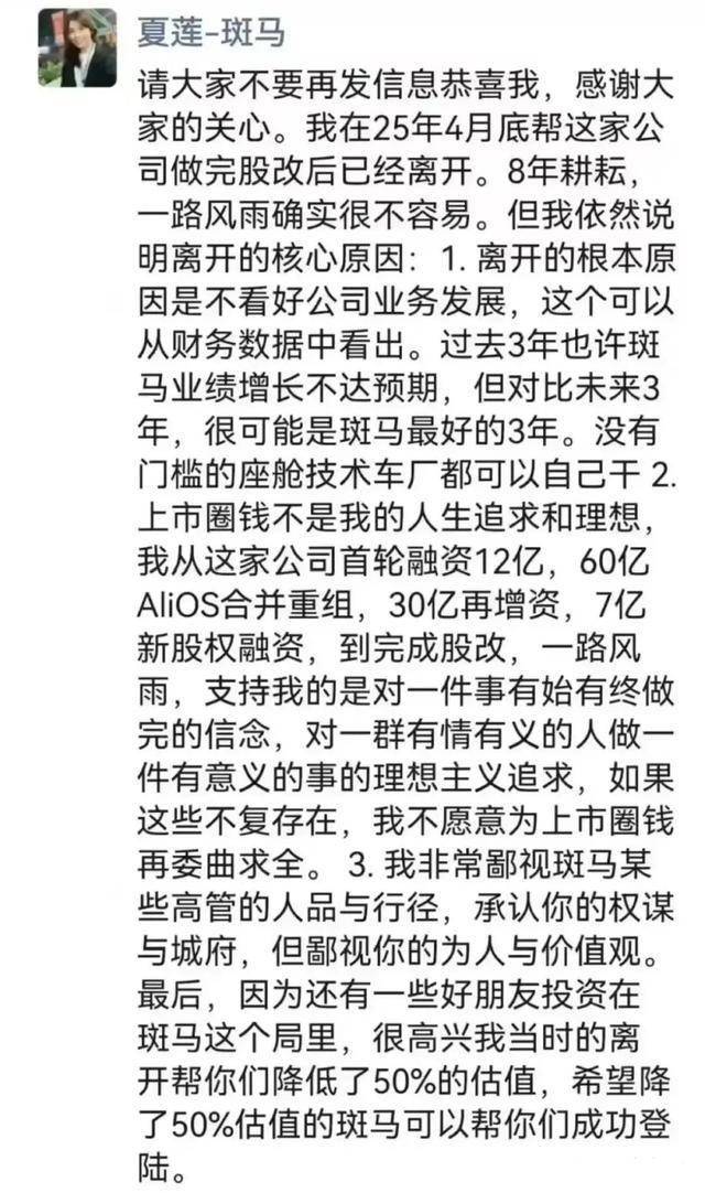 而据媒体报道,8月23日,斑马智行前CFO(首席财务官)夏莲在朋友圈发文,提到自己离开的根本原因是不看好公司业务发展,过去3年也许斑马业绩增长不达预期,但对比未来3年,很可能是斑马最好的3年。且称“没有门槛的座舱技术车厂都可以自己干”“不愿意为上市圈钱再委曲求全”。