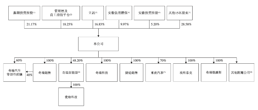 最大单一股东为芜湖投资控股,截至最后实际可行日期,持股约21.17%。招股书称,上市之后,芜湖投资控股仍将是奇瑞汽车最大单一股东。