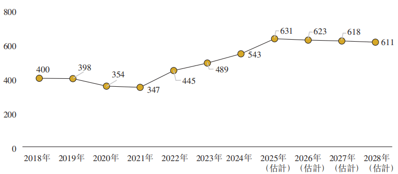 2018年至2028年(估计)CRU中国铝土矿价格(元/吨)