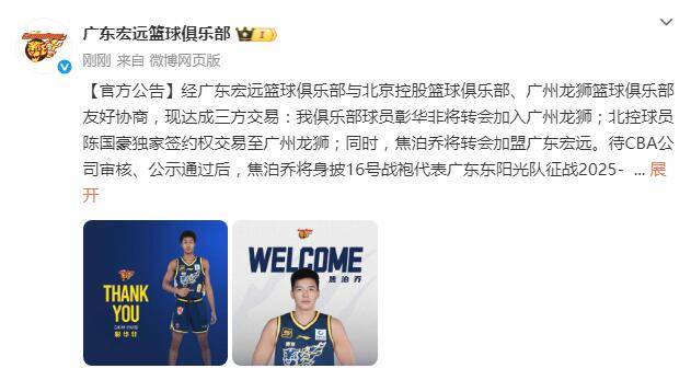 北京时间8月29日消息,广东宏远、广州龙狮和北京控股三家俱乐部同时发布公告,官宣三方交易达成:广东宏远球员彰华非转会加入广州龙狮;北控球员陈国豪独家签约权交易至广州龙狮;同时,焦泊乔将转会加盟广东宏远。