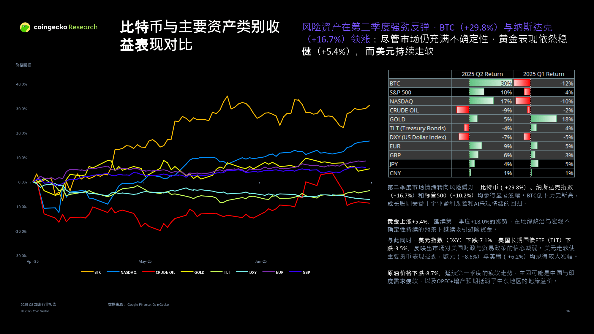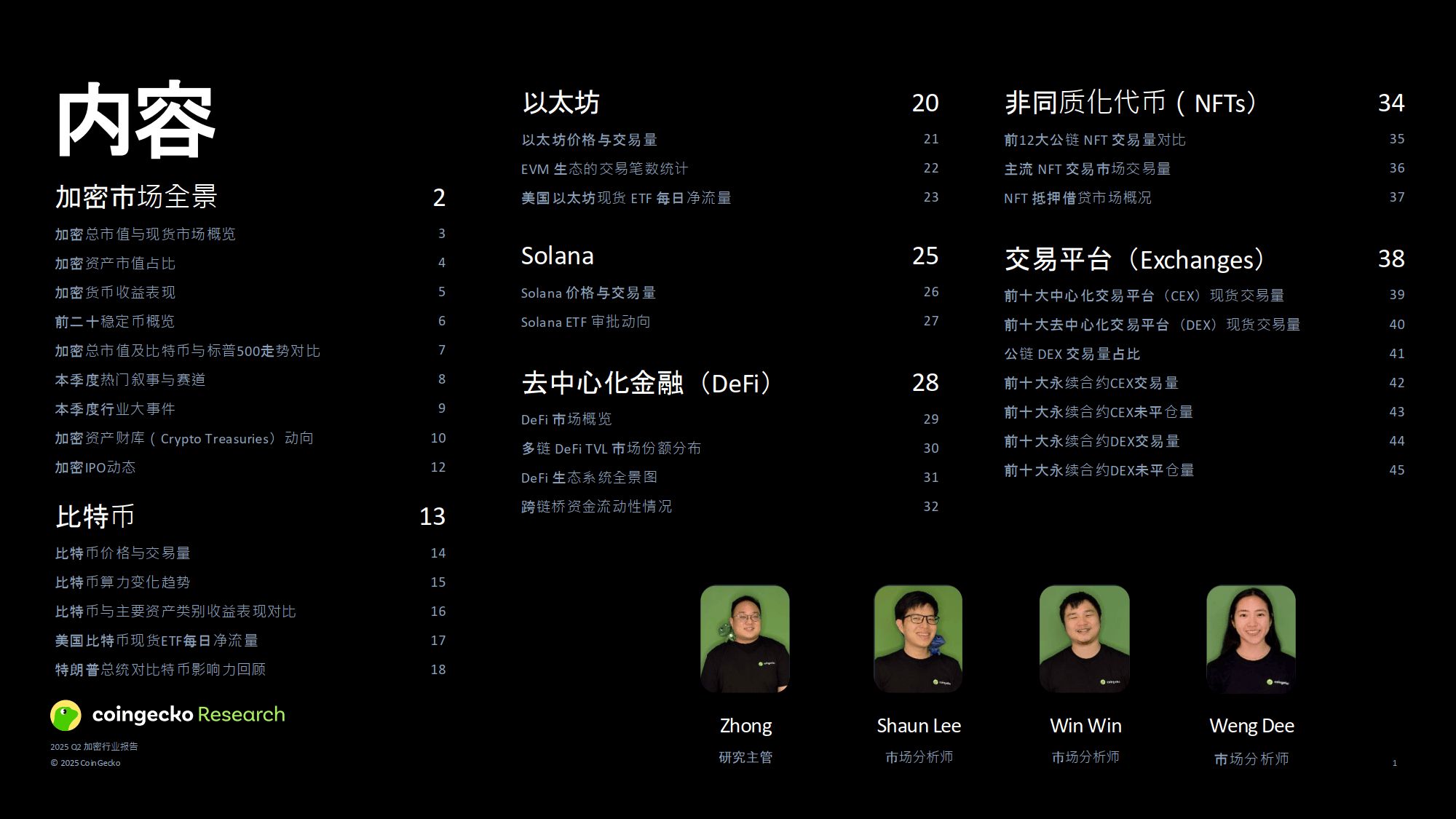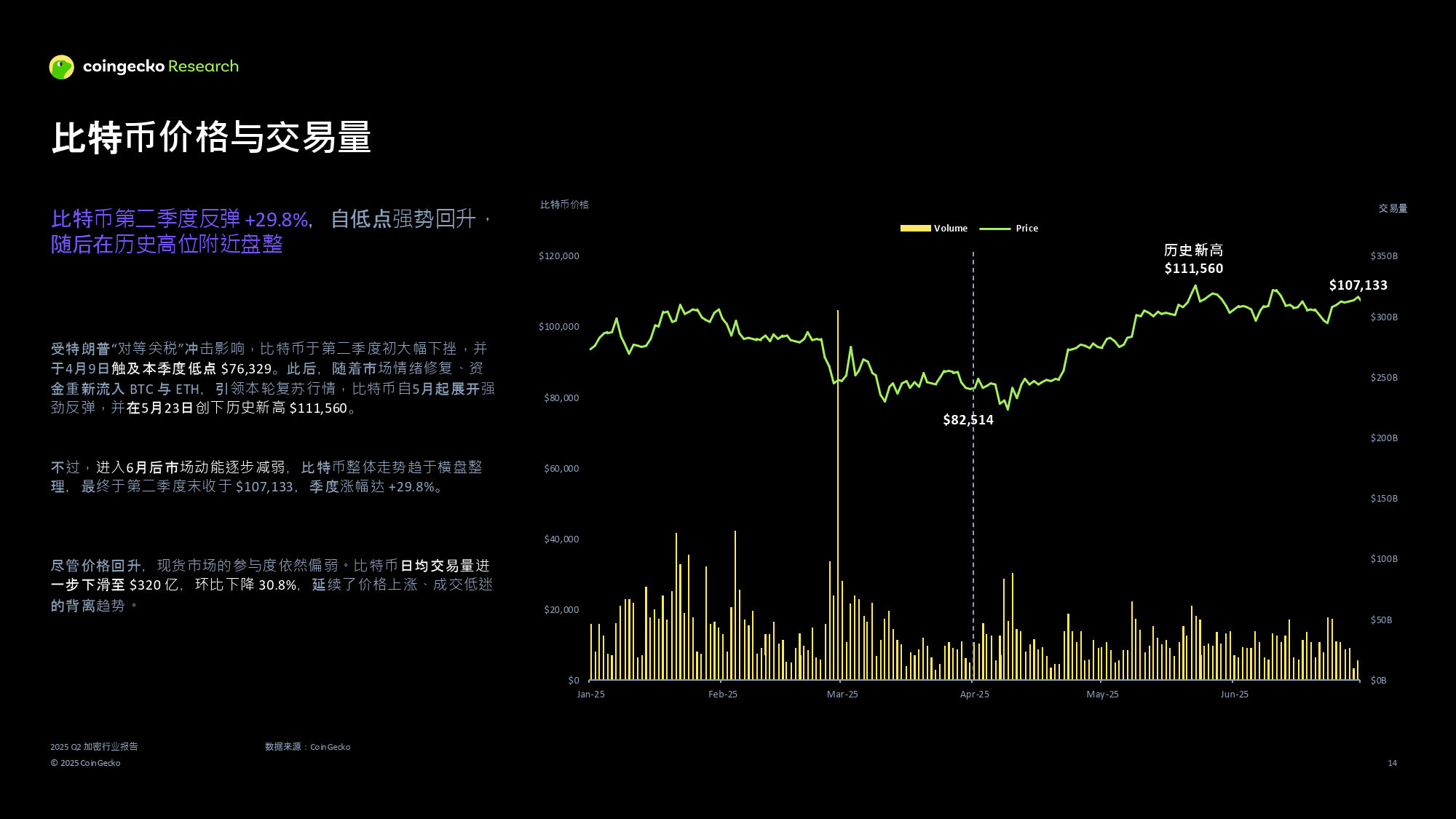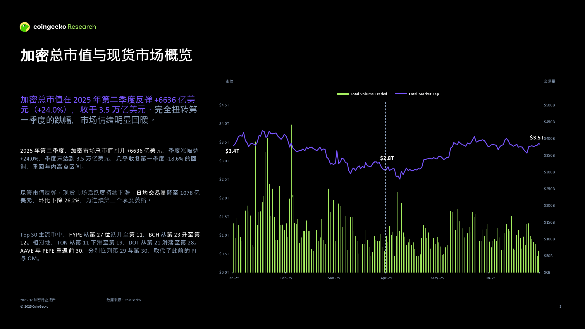 2025年Q2,CoinGecko发布加密货币行业报告,呈现市场多维度动态。整体市场回暖,总市值反弹24.0%至3.5万亿美元,扭转Q1跌幅,但现货日均交易量环比降26.2%至1078亿美元,连续两季萎缩。