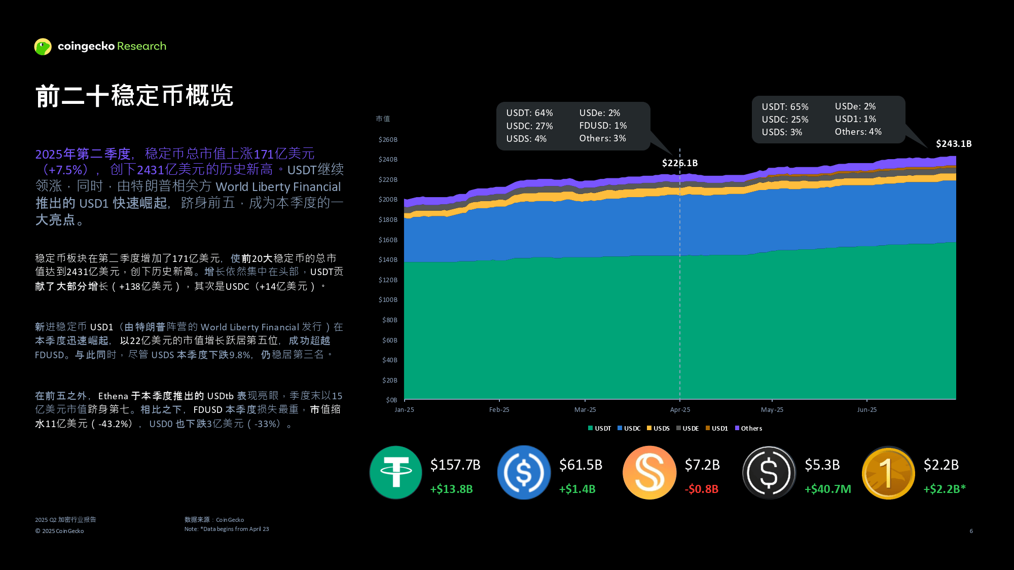 市值占比上,比特币占比升至62.1%,创2020年底后新高,年初至今累计升7.6个百分点;以太坊占比微升0.8个百分点至8.8%,山寨币占比降2.0个百分点至13.7%。收益表现分化,ETH涨36.4%领涨主流币,HYPE(+204.7%)、AAVE(+72.3%)等DeFi代币及FARTCOIN(+151.7%)等Meme币涨幅显著,AI板块仅TAO(+49.6%)、FET(+49.0%)上涨。稳定币总市值增7.5%至2431亿美元,USD1快速崛起跻身前五。