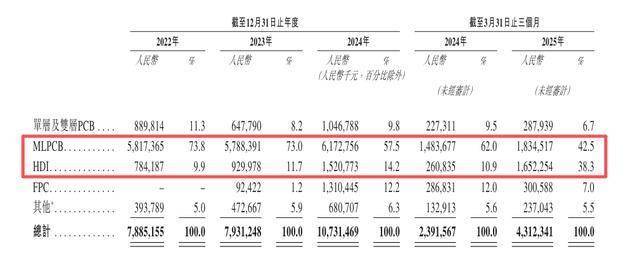 瑞财经《预审IPO》观察发现,2024年,胜宏科技的HDI和FPC业务的收入均实现高速增长,同比增长率分别为63.53%、1317.89%。截至2025年一季度,HDI的收入占比已达38.3%,较2024年大幅提升24.1个百分点。
