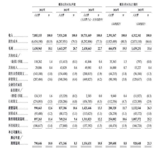 总体看胜宏科技近年来的业绩情况,2022年、2023年、2024年及2025年一季度(以下称“报告期”),分别实现营收78.58亿元、79.31亿元、107.31亿元及43.12亿元;净利分别为7.9亿元、6.71亿元、11.54亿元、9.21亿元。其中,2025年一季度业绩呈现高速增长态势,营收同比增长了80.31%,净利同比增长了339.22%。