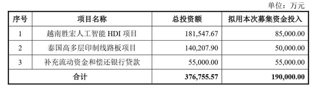 根据胜宏科技最新披露的《向特定对象发行股票募集说明书》,其拟将19亿元募集资金中的8.5亿元用于“越南胜宏人工智能HDI项目”、5亿元用于“泰国高多层印制线路板项目”、5.5亿元用于“补充流动资金和偿还银行贷款”。目前,该次定增已获得深交所的审核通过。
