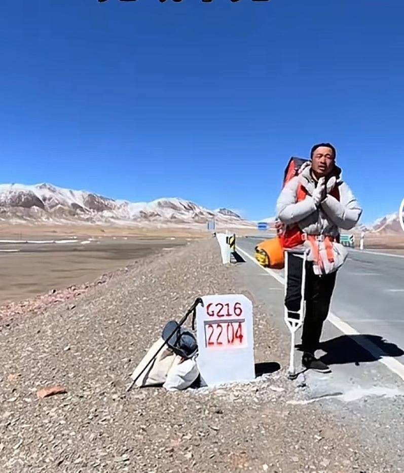 8月30日,有网友在西藏羌塘无人区偶遇一位独腿徒步者,其依靠拐杖在广袤无人区独自步行。