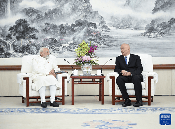 2025年8月31日,中共中央政治局常委、中央书记处书记蔡奇在天津会见来华出席2025年上海合作组织峰会的印度总理莫迪。