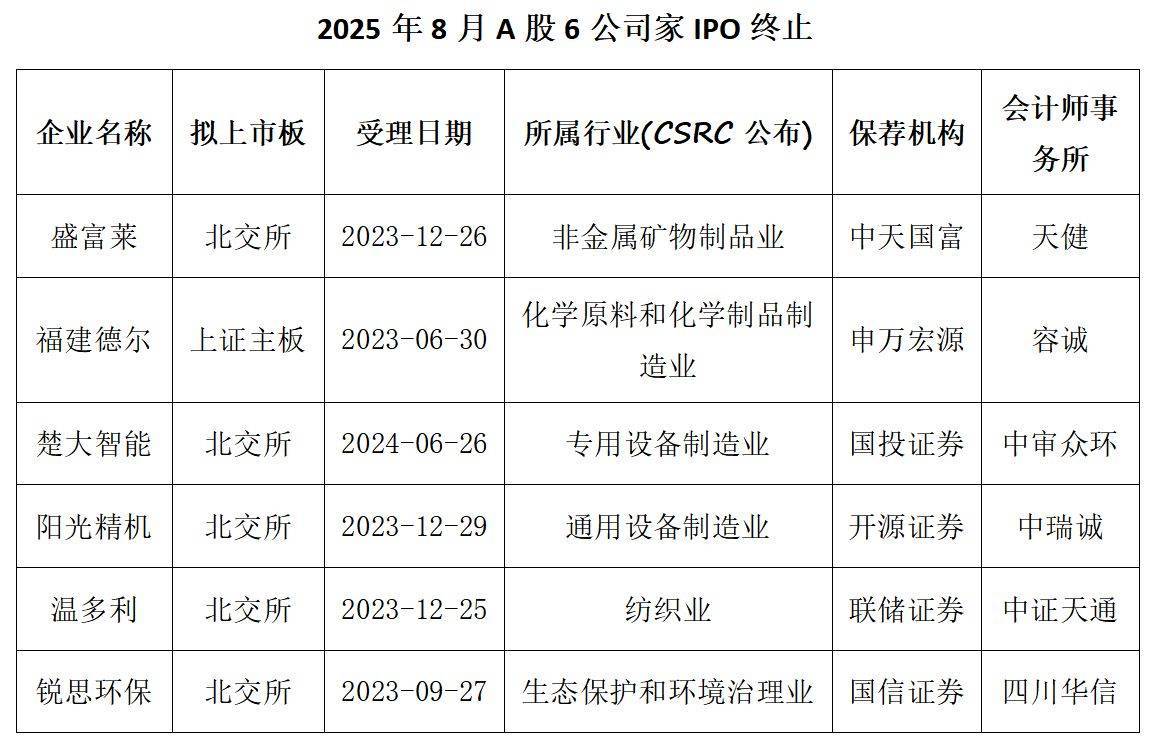 8月6家公司终止IPO,13家公司注册端进展较慢