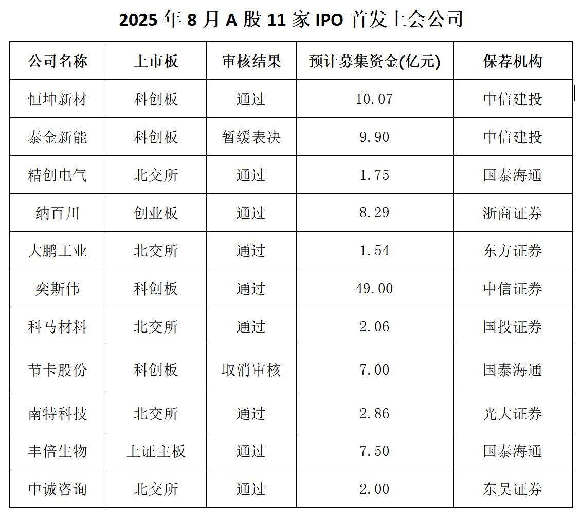 Wind数据显示,A股IPO市场今年8月共迎来11家公司首发上会,包括来自上证主板的丰倍生物,创业板的纳百川,科创板的恒坤新材、泰金新能、节卡股份和奕斯伟,以及北交所的精创电气、大鹏工业、南特科技、科马材料和中诚咨询,这一首发上会数创下了去年2月以来的月度新高。