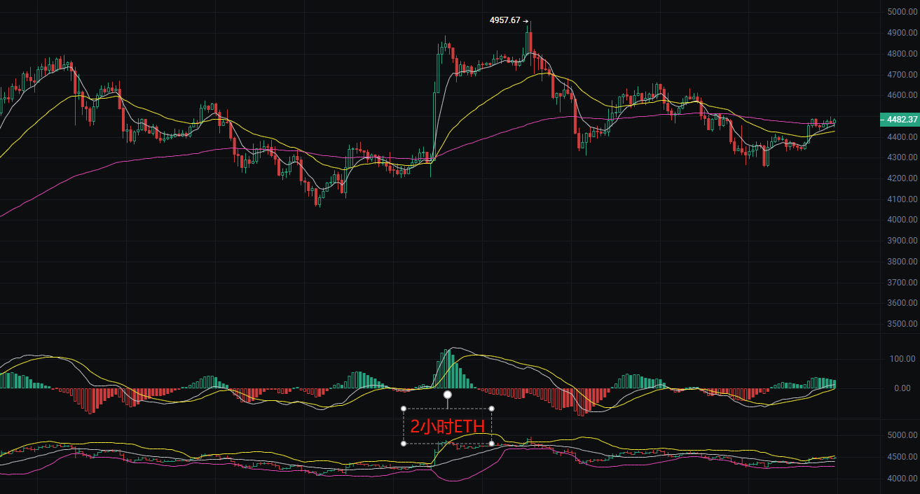 以太坊现价4480,丽盈发现目前以太坊明显的区间震荡行情短期趋势尚不明朗。从技术面来看,尽管价格近期有所上涨,但成交量极度缩量,形成明显的量价背离,显示出上涨动能的不足。同时丽盈认为黄昏之星形态的出现进一步强化了市场可能面临看跌反转的风险。均线系统虽短期向上但纠缠不清,进一步验证了市场趋势的不确定性,2小时K线形成短期压力位。下方丽盈观察4450区域多次被触及,但未跌破,表现出一定支撑,日线有反弹意图。MACD2小时短期趋势转强;日线动能开始增强。EMA2小时短期均线系统呈现多头排列,日线级别价格远离EMA120,表明长期趋势仍需观察,这种行情适合做波段