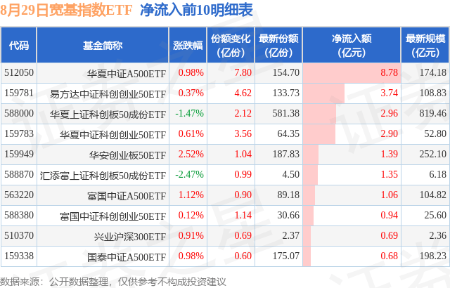 当日有72只宽基指数ETF基金出现资金净流入,其中净流入排首位的是华夏中证A500ETF(512050),份额增加了7.8亿份,净流入额为8.78亿元。