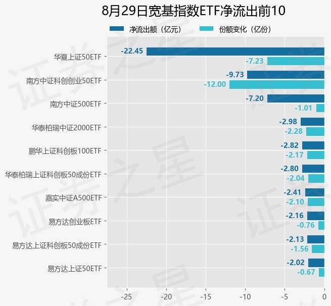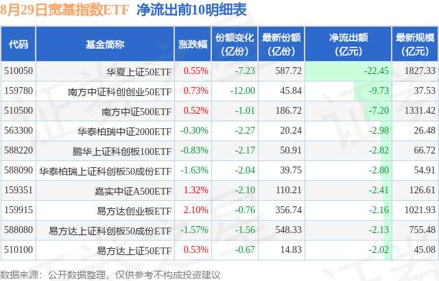 当日有150只宽基指数ETF基金出现资金净流出,其中净流出排首位的是华夏上证50ETF(510050),份额减少了7.23亿份,净流出额为22.45亿元。