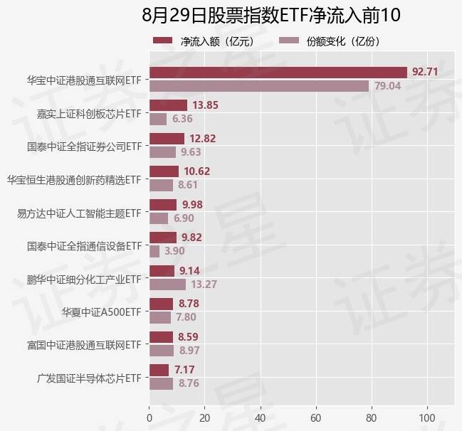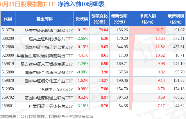 当日有415只股票指数ETF基金出现资金净流入,其中净流入排首位的是华宝中证港股通互联网ETF(513770),份额增加了79.04亿份,净流入额为92.71亿元。