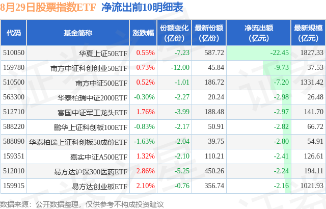 当日有347只股票指数ETF基金出现资金净流出,其中净流出排首位的是华夏上证50ETF(510050),份额减少了7.23亿份,净流出额为22.45亿元。