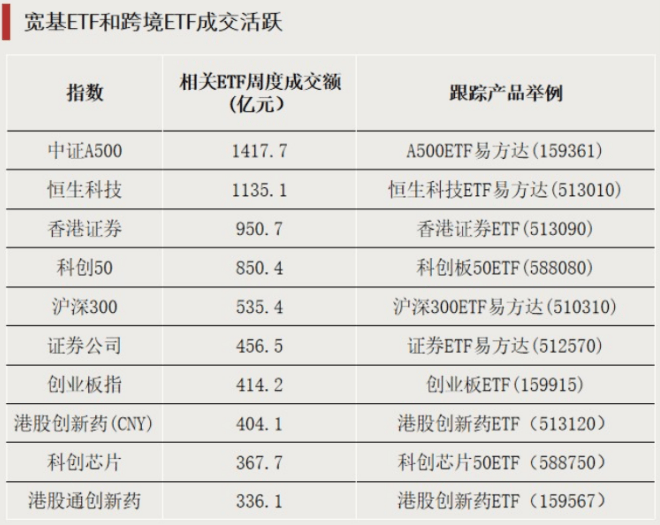 成交额方面,8月25日至29日,跟踪中证A500指数、科创50指数、沪深300指数、创业板指的宽基ETF,以及跟踪恒生科技指数、香港证券指数、港股创新药指数、港股通创新药指数的跨境ETF成交额较大。