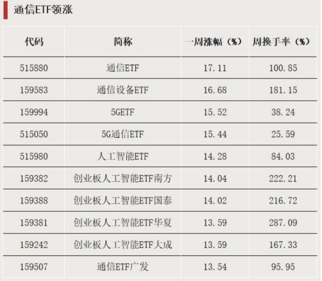 8月25日至29日,通信和人工智能相关ETF领涨,多只相关ETF涨幅超过13%。其中,通信ETF涨幅为17.11%,领涨市场。
