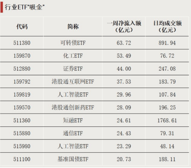 8月25日至29日,化工、证券、人工智能、通信等行业的ETF有较多资金流入。跟踪中证A500指数、科创50指数、沪深300指数、创业板指的宽基ETF,以及跟踪恒生科技指数、香港证券指数、港股创新药指数、港股通创新药指数的跨境ETF成交活跃。