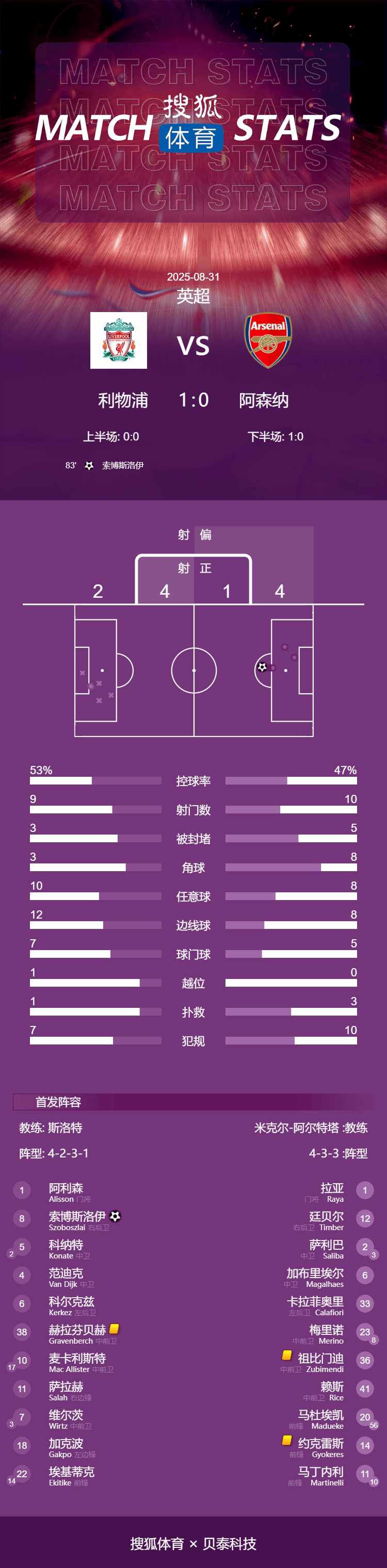 北京时间8月31日23时30分,2025-26赛季英超联赛第3轮焦点大战打响,卫冕冠军利物浦坐镇安菲尔德球场1-0战胜阿森纳,取得开局三连胜,并升至积分榜首位。全场唯一进球出现在第83分钟,索博斯洛伊利用任意球直接破门。此外,埃基蒂克有一个进球被吹,萨利巴、科纳特和维尔茨先后受伤离场。