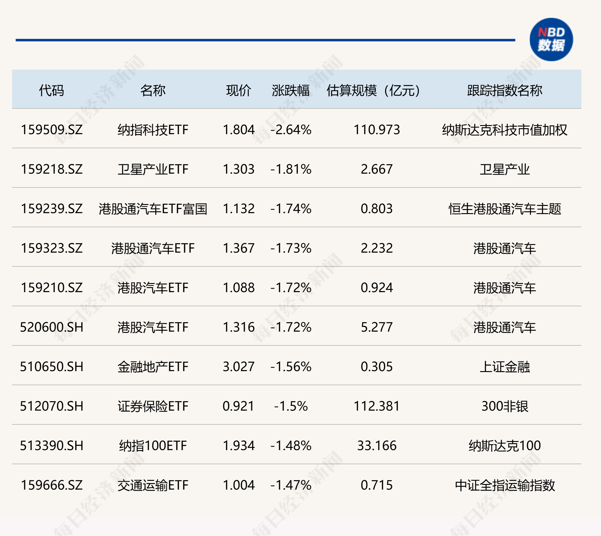 下跌方面,纳指科技ETF跌超2%,港股汽车相关ETF跌超1%。