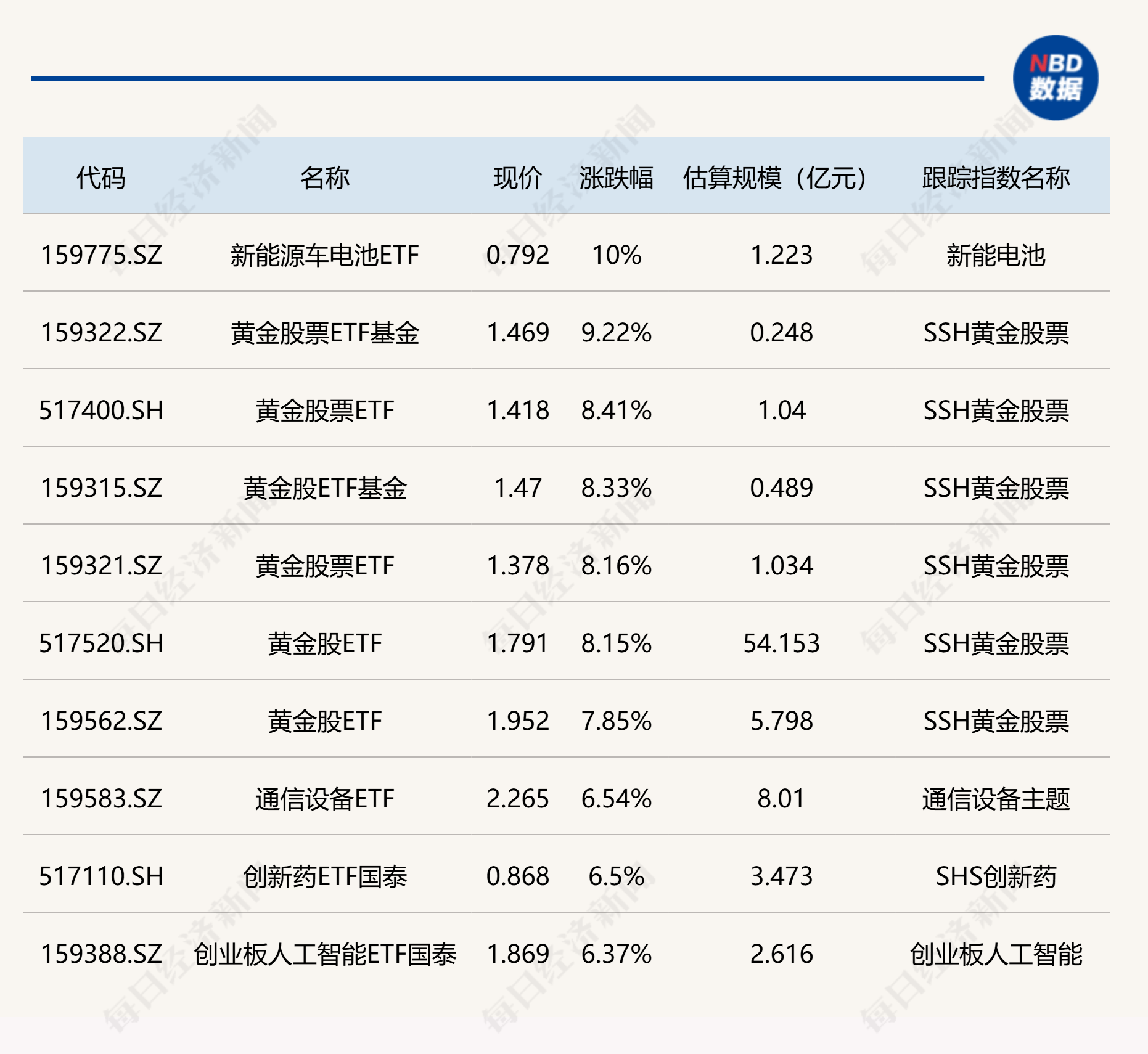 ETF上涨方面,新能源车电池ETF涨停,黄金股相关ETF涨超8%。