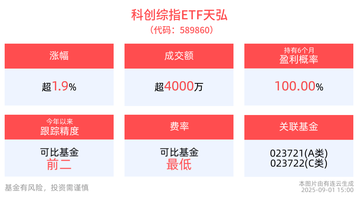 科创综指ETF天弘(589860,联接023722),覆盖科创板97%市值,全面覆盖硬科技,均衡配置半导体(海光信息、中芯国际)、人工智能(寒武纪)、生物医药(百利天恒)等战略新兴产业占比超80%。