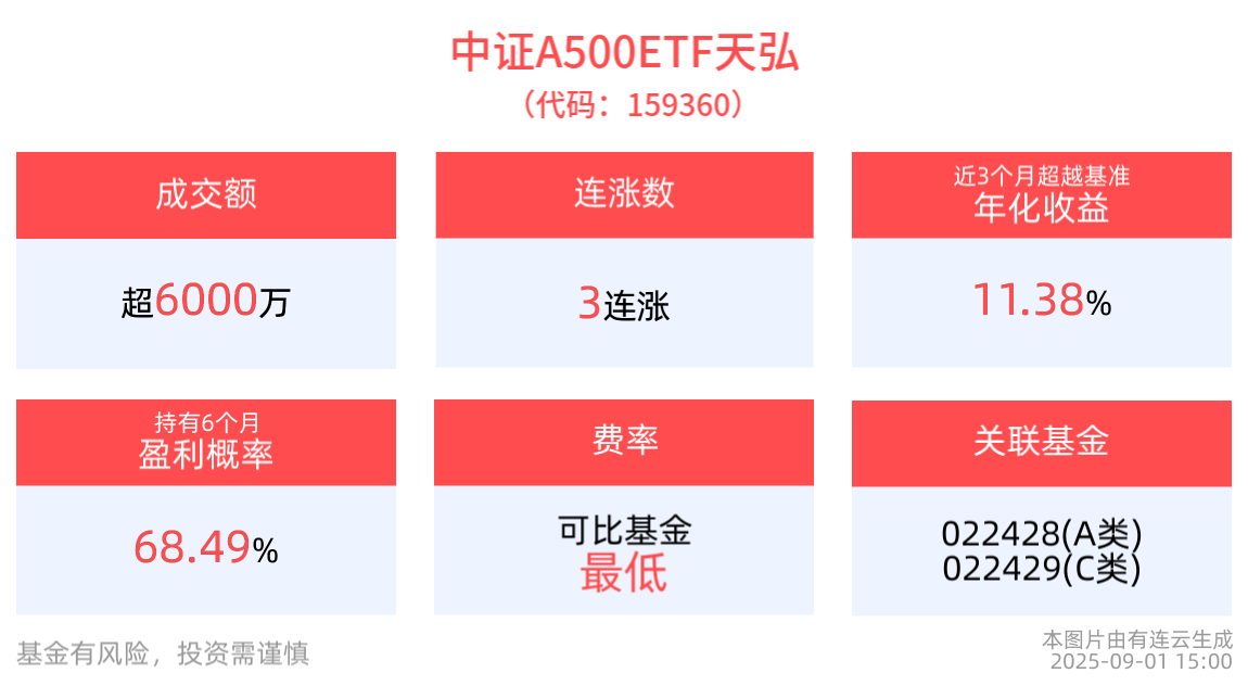 中证A500ETF天弘(159360)上涨0.50%,实现3连涨,换手3.54%,成交6359.06万元。跟踪指数成分股兴齐眼药(300573)上涨14.65%,先导智能(300450)上涨14.62%,中际旭创(300308)上涨14.42%,天孚通信(300394)上涨11.90%,迈为股份(300751)上涨11.45%。