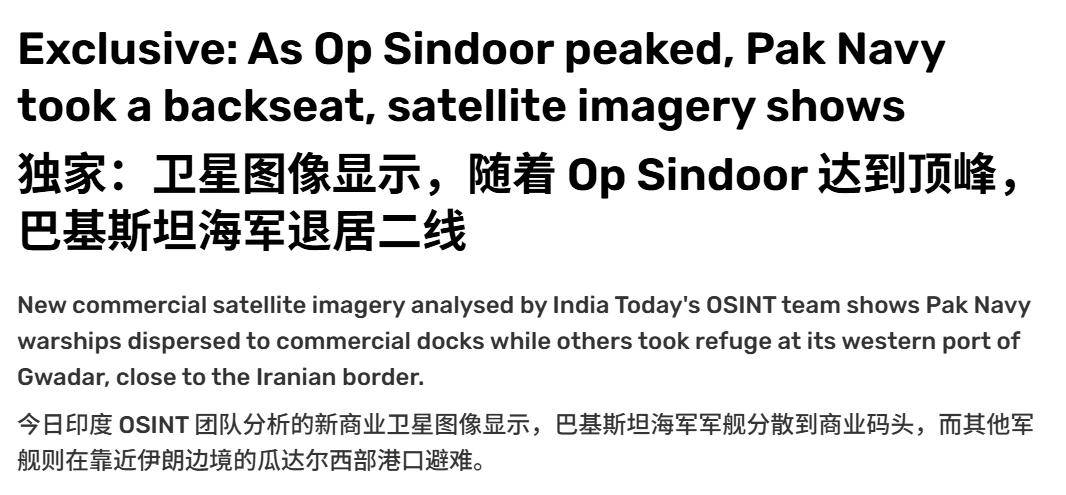 印媒这类说法相当有问题,等于反转了之前所有报道。在印巴冲突期间,有印度媒体曾经说,印度海军航母出海了,但是卫星照片则显示其航母压根没有出击。相反,根据巴基斯坦公布的航迹,印度航母一直躲在距离巴基斯坦800公里外的海域。