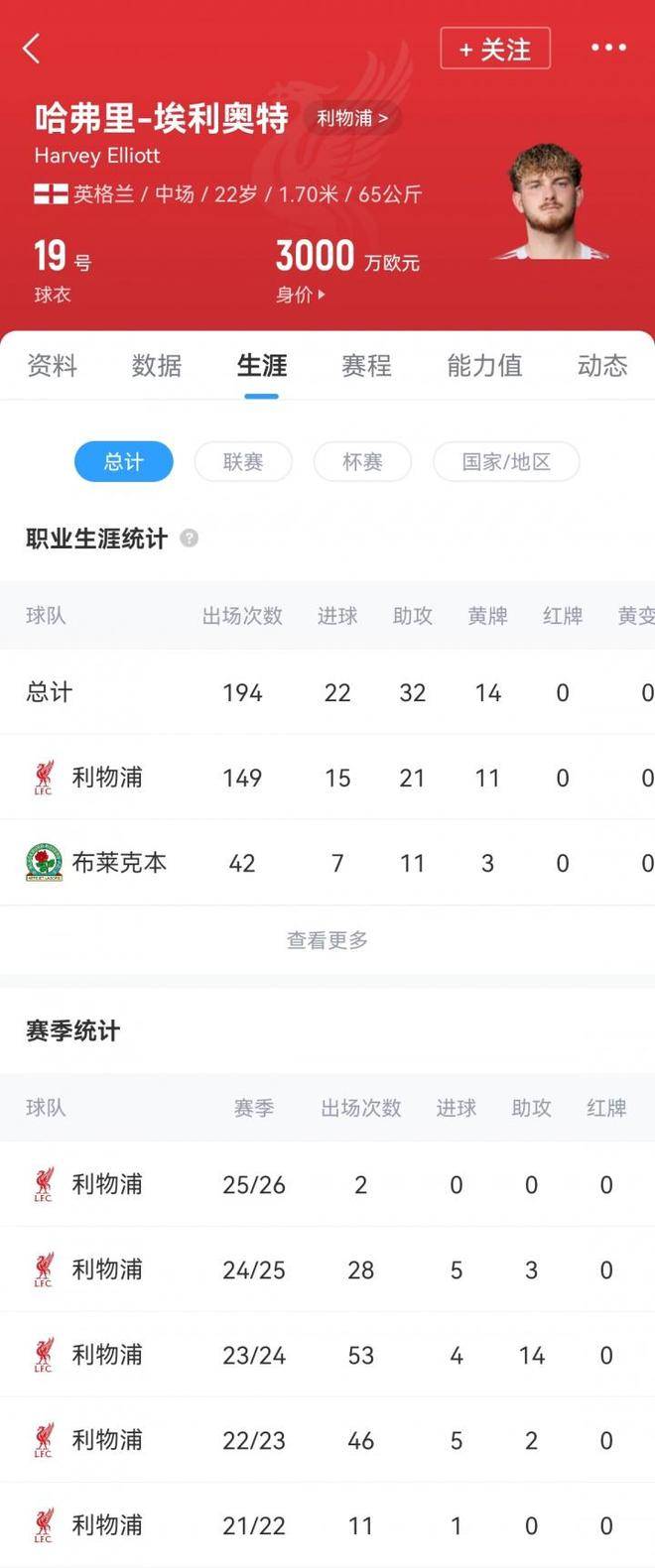 埃利奥特16岁被利物浦170万欧从富勒姆青训挖来,至今共为利物浦一线队出场149次,打入15球21助攻。