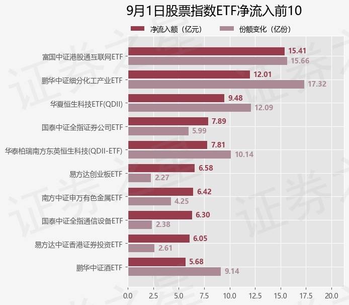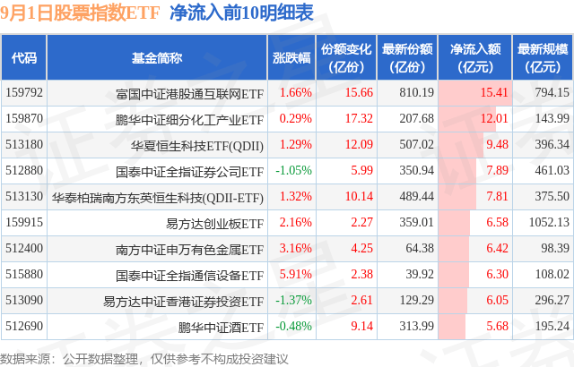 当日有372只股票指数ETF基金出现资金净流入,其中净流入排首位的是富国中证港股通互联网ETF(159792),份额增加了15.66亿份,净流入额为15.41亿元。