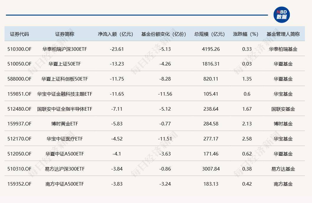 与此同时,华泰柏瑞沪深300ETF份额减少5.13亿份,净流出额23.61亿元;华夏上证50ETF份额减少4.26亿份,净流出额13.23亿元;华夏上证科创板50ETF份额减少8.28亿份,净流出额11.75亿元。