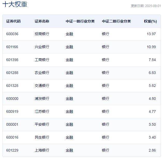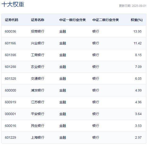 中证银行指数发布于2013年7月15日,为反映中证全指指数样本中银行行业公司证券的整体表现,为投资者提供分析工具。成分股分布于银行业,平均市值较大,持仓集中度较高。