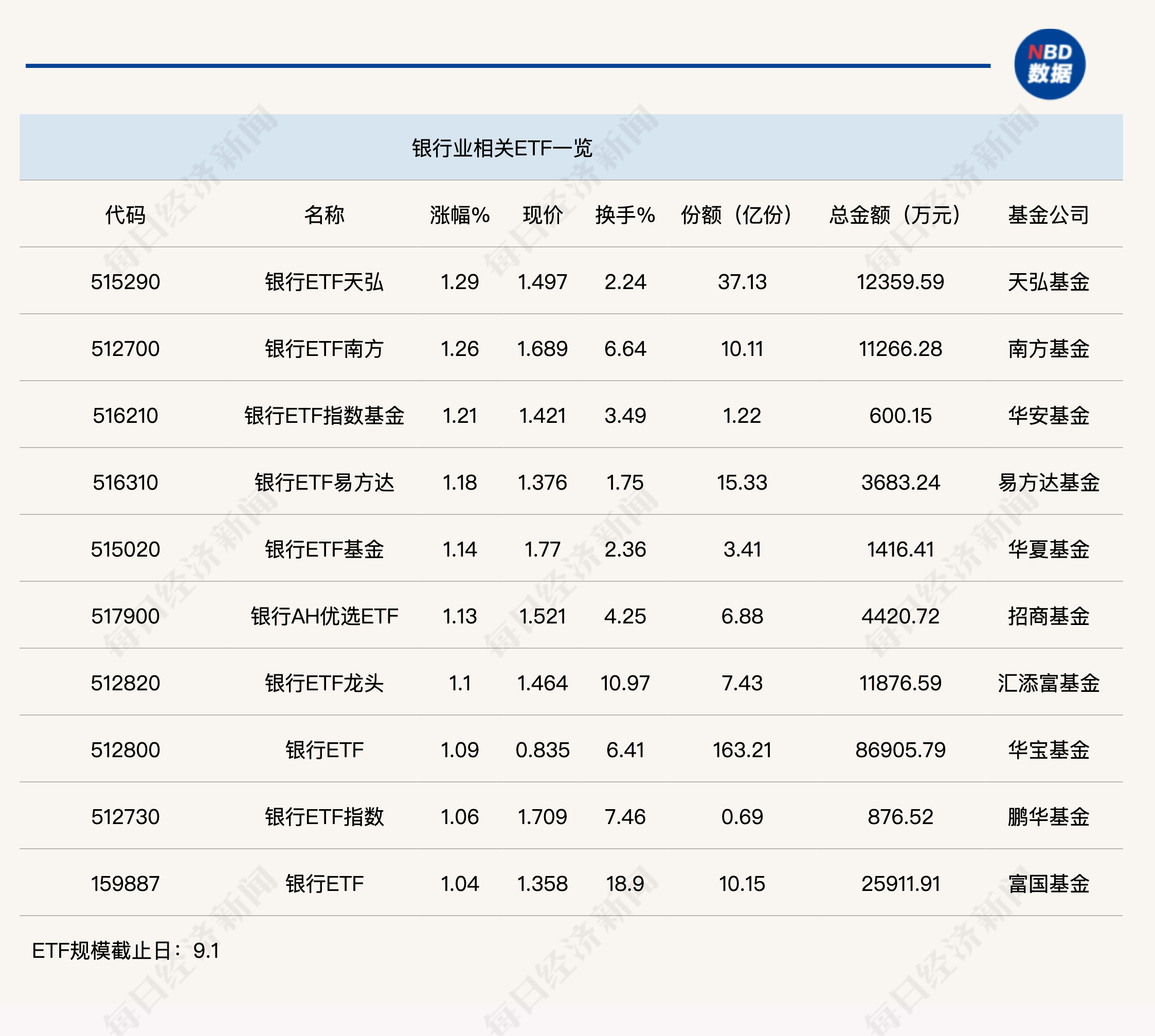 涨幅榜上,银行相关ETF反弹,包括银行ETF天弘(515290)在内的10只银行ETF半日涨幅均超过1%。