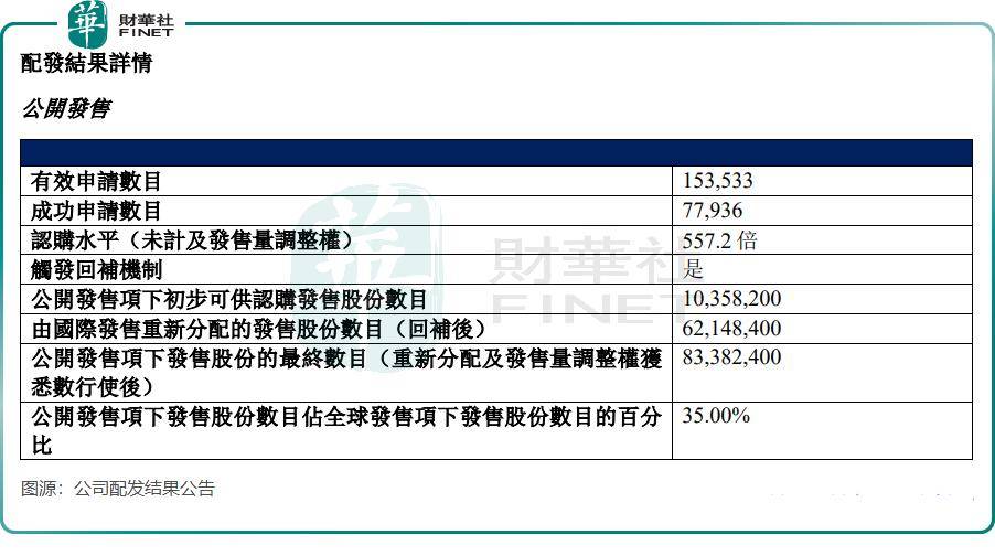 根据公司披露的配发结果,公司香港公开发售有效申请数目达15.35万,共获557.2倍认购(未计及发售量调整权),成功跻身今年以来港股IPO市场认购倍数前十名。国际发售认购水平(未计及发售量调整权)则为8.3倍。