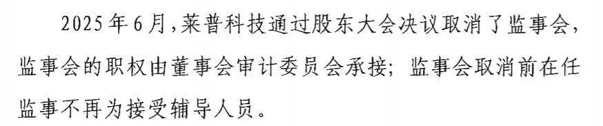 2025年6月,莱普科技通过股东大会决议取消了监事会,监事会的职权由董事会审计委员会承接;监事会取消前在任监事不再为接受辅导人员。