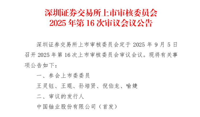 根据深交所上市审核委员会8月29日发布的2025年第16次审议会议公告,深交所上市审核委员会定于2025年9月5日召开2025年第16次上市审核委员会审议会议,会议将审核中国铀业股份有限公司(以下简称“中国铀业”)首发事宜。如无意外,中国铀业将顺利通过这次审核而成功过会。
