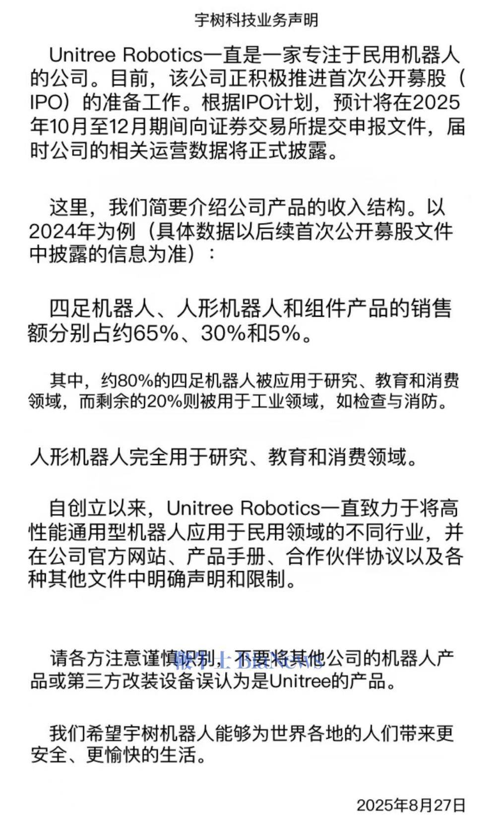 宇树科技称,Unitree Robotics一直是一家专注于民用机器人的公司。