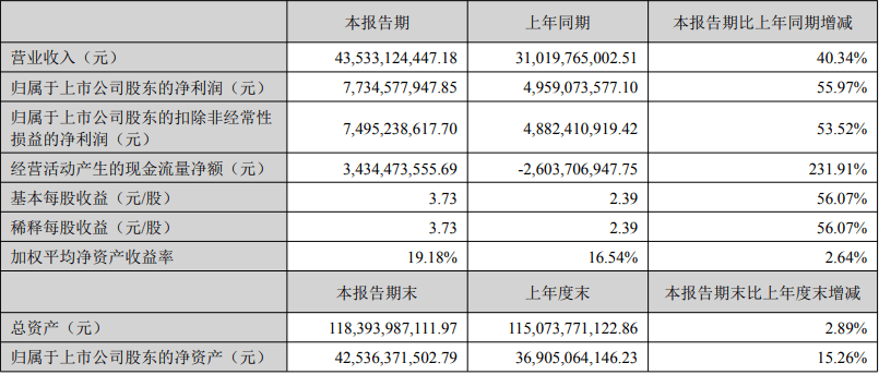 财报显示,阳光电源上半年实现营业收入435.33亿元,同比增长40.34%;实现归属于上市公司股东的净利润77.35亿元,同比大增55.97%。
