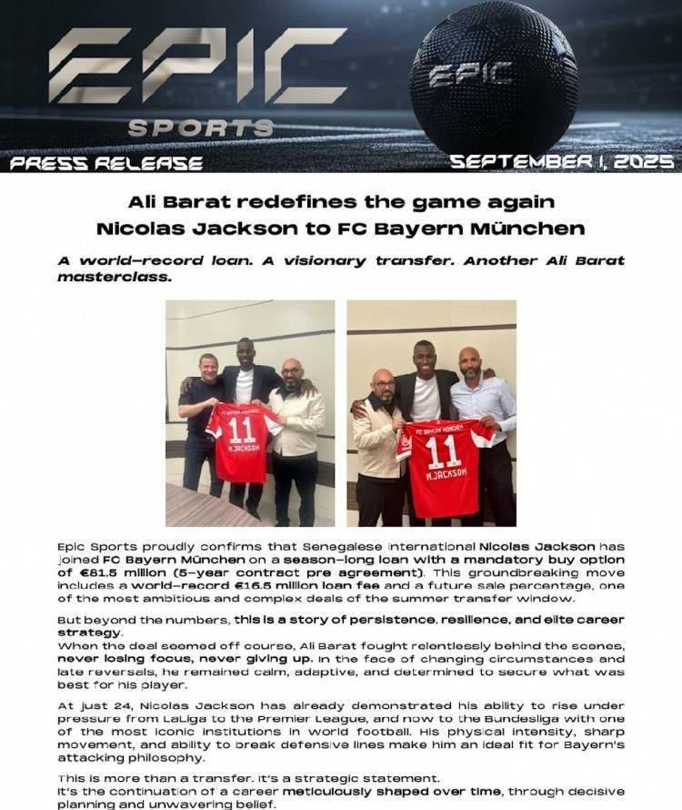 “Epic Sports自豪地宣布,塞内加尔国脚尼古拉斯-杰克逊已加盟拜仁慕尼黑,形式为为期一年的租借,附带强制买断条款,总价为8150万欧元(协议包含5年合同预签)。”