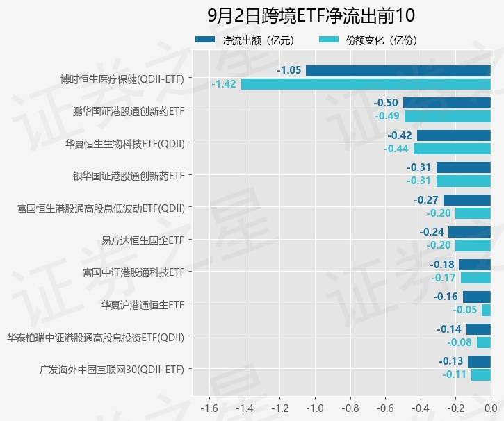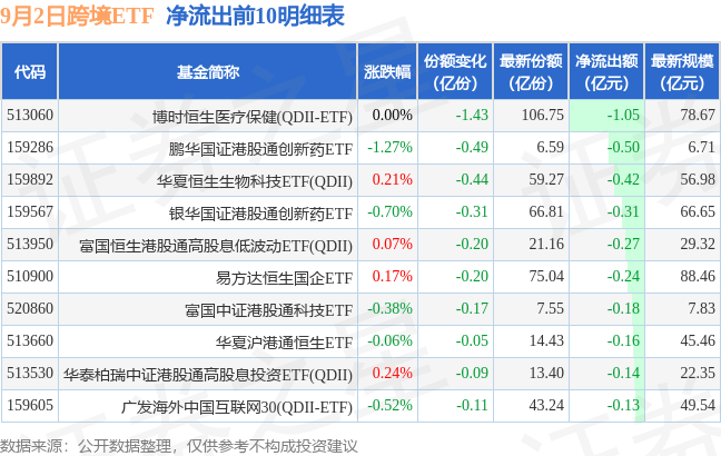 当日有33只跨境ETF基金出现资金净流出,其中净流出排首位的是博时恒生医疗保健(QDII-ETF)(513060),份额减少了1.43亿份,净流出额为1.05亿元。