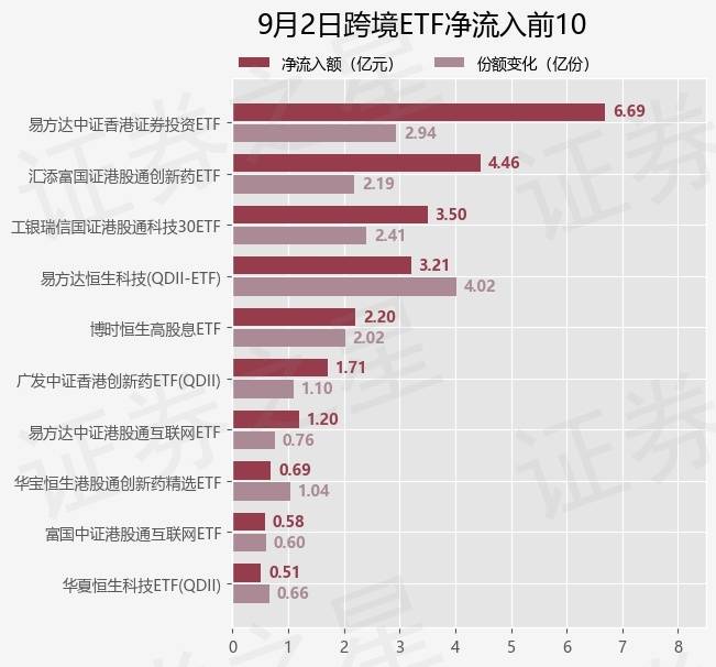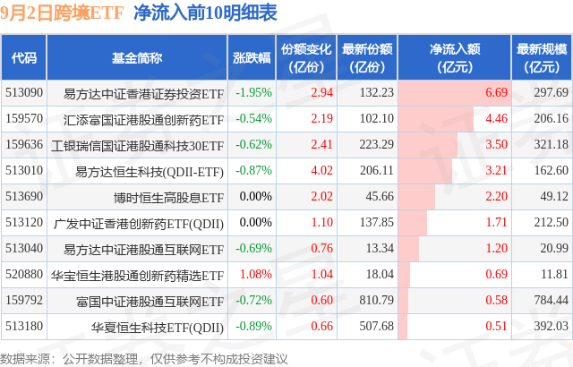 当日有57只跨境ETF基金出现资金净流入,其中净流入排首位的是易方达中证香港证券投资ETF(513090),份额增加了2.94亿份,净流入额为6.69亿元。