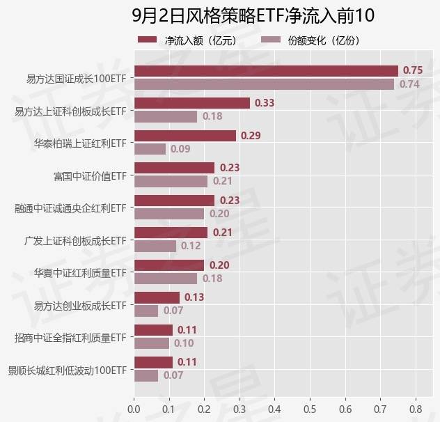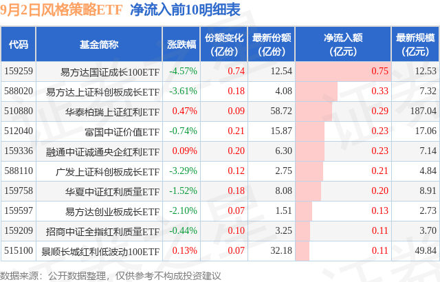 当日有19只风格策略ETF基金出现资金净流入,其中净流入排首位的是易方达国证成长100ETF(159259),份额增加了7400.0万份,净流入额为7509.65万元。