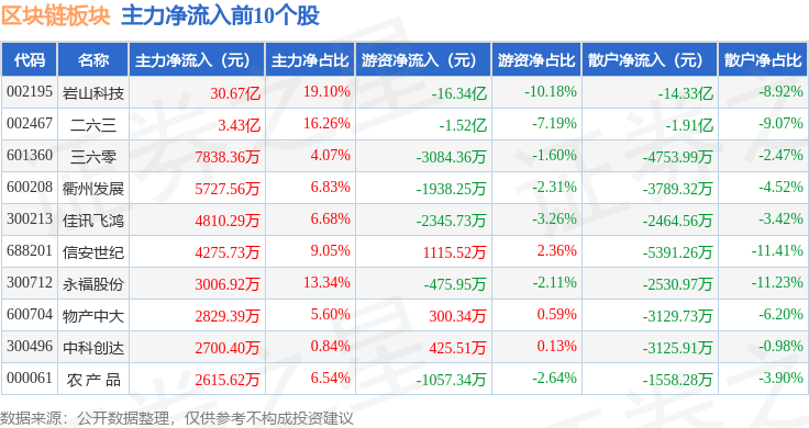 从资金流向上来看,当日区块链板块主力资金净流出117.12亿元,游资资金净流入3.06亿元,散户资金净流入114.07亿元。区块链板块个股资金流向见下表:
