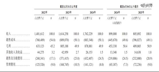 6万家经销门店撑起了宜品乳业的大部分营收。招股书显示,2022年、2023年、2024年和2025年前六个月,公司营业收入分别为14.02亿、16.14亿、17.62亿和8.06亿元;相对应的毛利分别为6.33亿、8.05亿、8.79亿、4.10亿元;净利润分别为人民币2.27亿、1.68亿、1.72亿和0.57亿元。