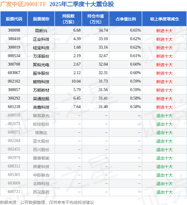 根据2025基金半年报公募基金重仓股数据,重仓该股的公募基金共1家,其中持有数量最多的公募基金为广发基金的广发中证2000ETF。广发中证2000ETF目前规模为0.54亿元,最新净值1.4332(9月2日),较上一交易日下跌1.97%,近一年上涨82.6%。该公募基金现任基金经理为夏浩洋。夏浩洋在任的基金产品包括:广发中证光伏产业指数A,管理时间为2021年7月6日至今,期间收益率为-36.88%;广发海外中国互联网30(QDII-ETF),管理时间为2021年11月24日至今,期间收益率为10.53%;广发中证光伏龙头30ETF,管理时间为2022年11月24日至今,期间收益率为-42.6%;广发中证环保ETF联接A,管理时间为2023年5月15日至今,期间收益率为-12.15%。