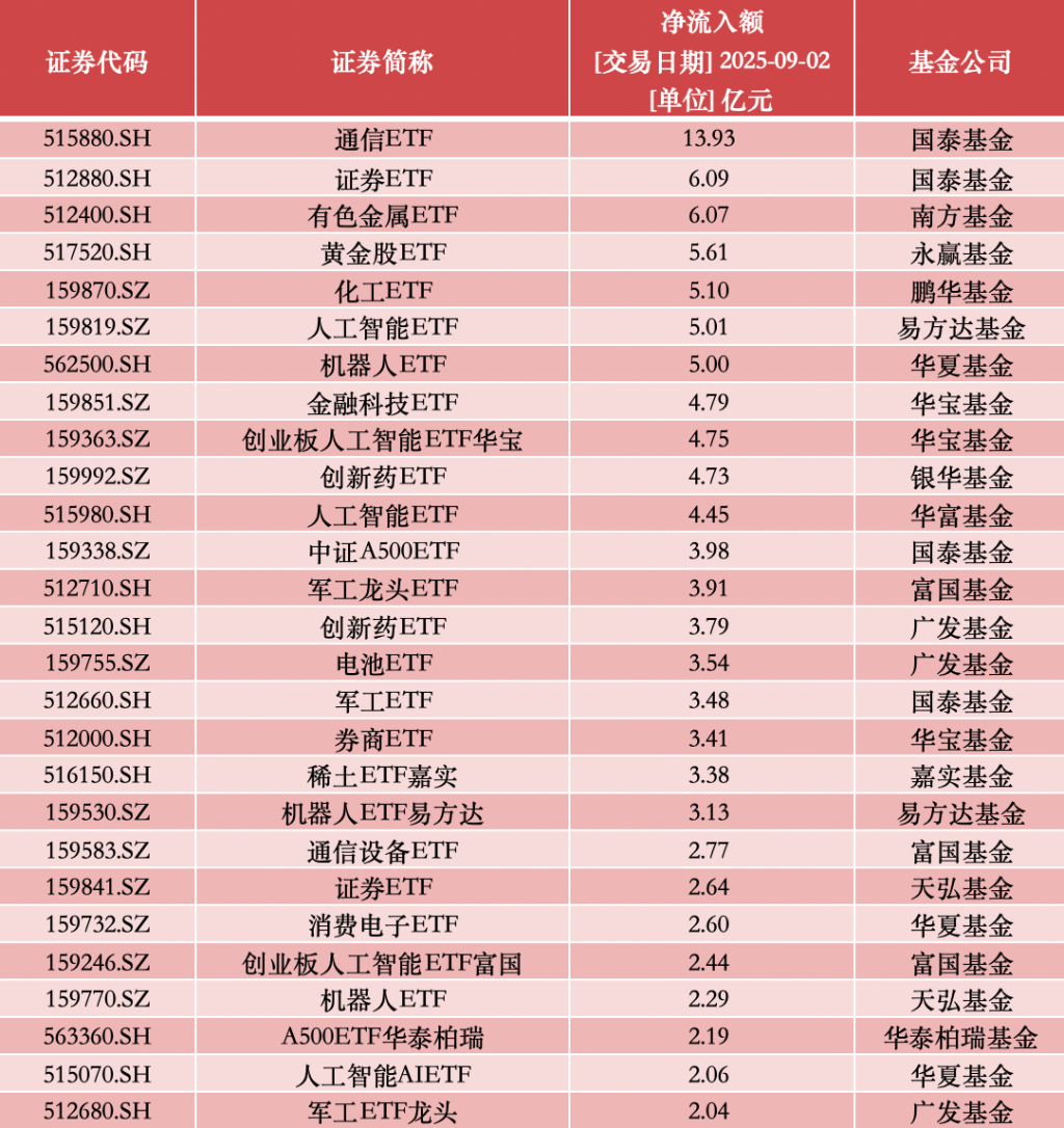 具体来看,9月2日,国泰中证全指通信设备ETF以13.93亿元的净流入额位居榜首,遥遥领先其他ETF。