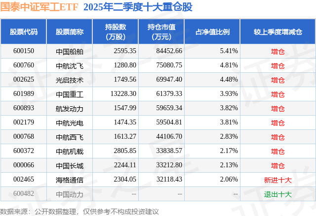根据2025基金半年报公募基金重仓股数据,重仓该股的公募基金共22家,其中持有数量最多的公募基金为国泰基金的国泰中证军工ETF。国泰中证军工ETF目前规模为156.01亿元,最新净值1.2743(9月2日),较上一交易日下跌2.45%,近一年上涨56.93%。该公募基金现任基金经理为艾小军。艾小军在任的基金产品包括:国泰金融ETF联接A,管理时间为2014年1月13日至今,期间收益率为173.97%;国泰上证180金融ETF,管理时间为2014年1月13日至今,期间收益率为193.51%;国泰黄金ETF,管理时间为2014年1月13日至今,期间收益率为211.31%;国泰中证计算机主题ETF联接A,管理时间为2015年3月26日至今,期间收益率为6.32%。